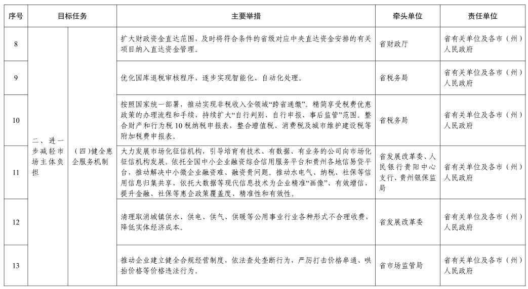 (四)健全惠企服務機制。擴大財政資金直達范圍,及時將符合條件的省級對應中央直達資金安排的有關項目納入直達資金管理。優(yōu)化國庫退稅審核程序,逐步實現(xiàn)智能化、自動化處理。按照國家統(tǒng)一部署,推動實現(xiàn)非稅收入全領域“跨省通繳”。精簡享受稅費優(yōu)惠政策的辦理流程和手續(xù),持續(xù)擴大“自行判別、自行申報、事后監(jiān)管”范圍。整合財產(chǎn)和行為稅10稅納稅申報表,整合增值稅、消費稅及城市維護建設稅等附加稅費申報表。大力發(fā)展市場化征信機構,引導培育有技術、有數(shù)據(jù)、有業(yè)務的公司向市場化征信機構發(fā)展。依托全國中小企業(yè)融資綜合信用服務平臺和貴州各地信易貸平臺,推動解決中小微企業(yè)融資難、融資貴問題。推動水電氣、納稅、社保等信用信息歸集共享,依托大數(shù)據(jù)等現(xiàn)代信息技術為企業(yè)精準“畫像”、有效增信,提升金融、社保等惠企政策覆蓋度、精準性和有效性。清理取消城鎮(zhèn)供水、供電、供氣、供暖等公用事業(yè)行業(yè)各種形式不合理收費,降低實體經(jīng)濟成本。推動企業(yè)建立健全合規(guī)經(jīng)營制度,依法查處壟斷行為,嚴厲打擊價格串通、哄抬價格等價格違法行為。深入開展“千企面對面”科技服務行動,加大企業(yè)科技供給。