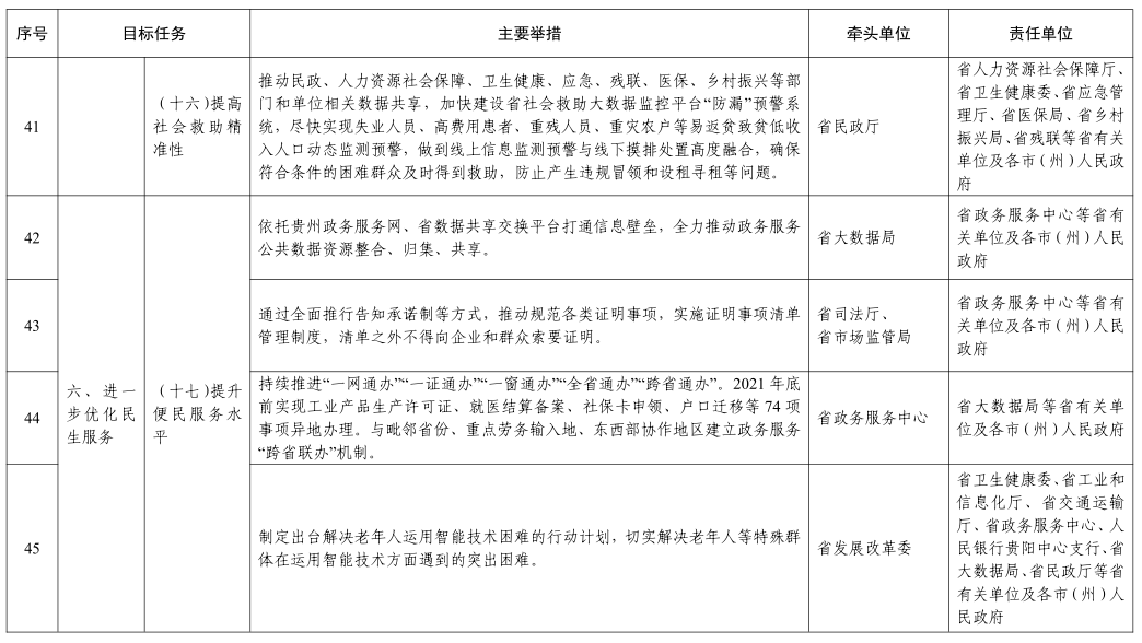 (十七)提升便民服務水平。依托貴州政務服務網(wǎng)、省數(shù)據(jù)共享交換平臺打通信息壁壘,全力推動政務服務公共數(shù)據(jù)資源整合、歸集、共享。通過全面推行告知承諾制等方式,推動規(guī)范各類證明事項,實施證明事項清單管理制度,清單之外不得向企業(yè)和群眾索要證明。持續(xù)推進“一網(wǎng)通辦”“一證通辦”“一窗通辦”“全省通辦”“跨省通辦”。2021年底前實現(xiàn)工業(yè)產(chǎn)品生產(chǎn)許可證、就醫(yī)結算備案、社保卡申領、戶口遷移等74項事項異地辦理。與毗鄰省份、重點勞務輸入地、東西部協(xié)作地區(qū)建立政務服務“跨省聯(lián)辦”機制。制定出臺解決老年人運用智能技術困難的行動計劃,切實解決老年人等特殊群體在運用智能技術方面遇到的突出困難。