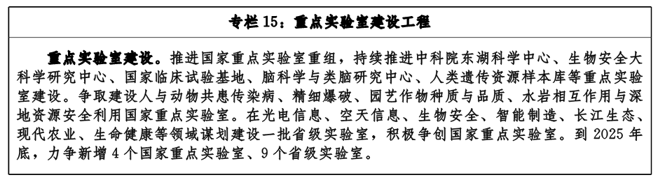 ——創(chuàng)新基礎(chǔ)設施建設實現(xiàn)全國領(lǐng)先。建成一批具有重要影響力的大科學裝置、重點實驗室、創(chuàng)新中心等科技創(chuàng)新平臺,實現(xiàn)科技創(chuàng)新成果與地方產(chǎn)業(yè)有效對接,科技成果向現(xiàn)實生產(chǎn)力轉(zhuǎn)化能力大幅提升。國家重大科技基礎(chǔ)設施達到6個,國家級重點實驗室和省級重點實驗室分別達到32個和190個。