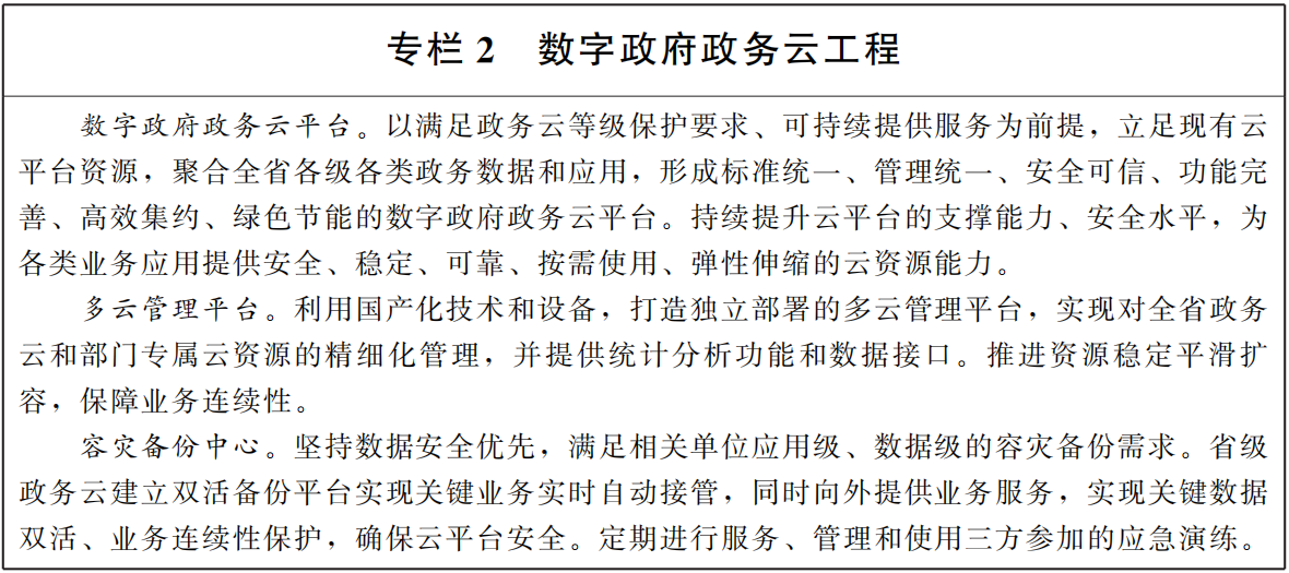 2.提供開放共享的政務(wù)云服務(wù)。堅(jiān)持省級(jí)統(tǒng)籌,整合現(xiàn)有云資源,完善省市兩級(jí)政務(wù)云平臺(tái),推動(dòng)系統(tǒng)遷移上云。建設(shè)多云管理平臺(tái),對數(shù)字政府政務(wù)云平臺(tái)進(jìn)行統(tǒng)一管理、監(jiān)控和運(yùn)維。同步建設(shè)容災(zāi)備份設(shè)施,完善應(yīng)急保障機(jī)制,確保政務(wù)云穩(wěn)定安全可靠。