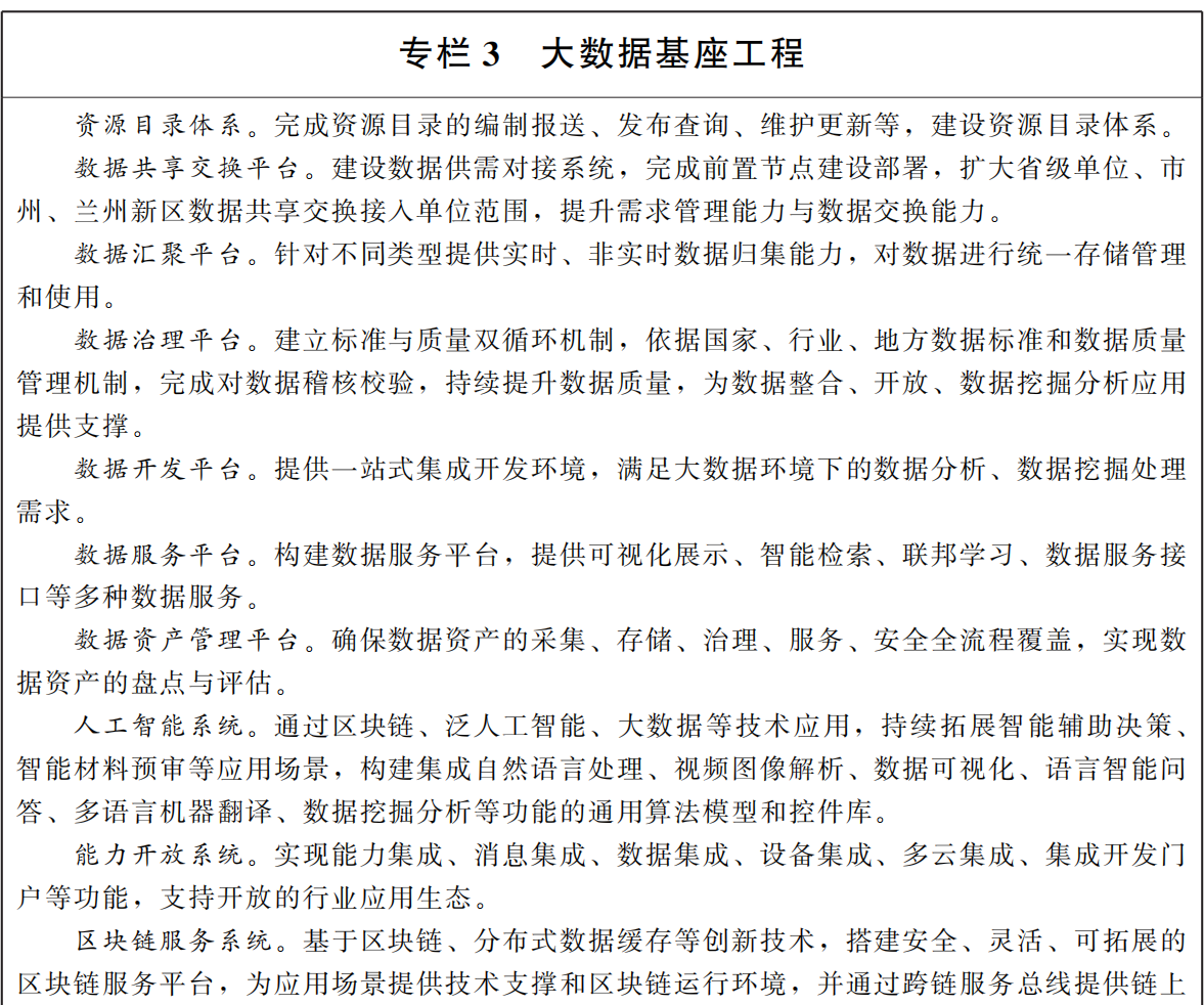 ——打造賦能特色數(shù)字政府。聚焦甘肅數(shù)字政府特色品牌建設(shè),深化區(qū)塊鏈應(yīng)用,加快推進(jìn)公共數(shù)據(jù)開放共享和數(shù)據(jù)標(biāo)準(zhǔn)化建設(shè),深度應(yīng)用于政務(wù)服務(wù)、城市管理、民生服務(wù)等方面,數(shù)據(jù)價(jià)值不斷凸顯,數(shù)字政府引領(lǐng)智慧城市、數(shù)字經(jīng)濟(jì)、數(shù)字社會(huì)發(fā)展。