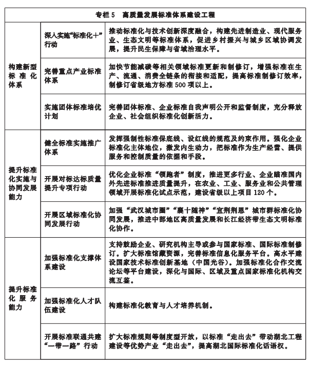 ——質(zhì)量發(fā)展水平躍上新臺階。質(zhì)量強(qiáng)省戰(zhàn)略實(shí)施成效顯著,標(biāo)準(zhǔn)化綜合改革穩(wěn)步推進(jìn),社會公用計(jì)量標(biāo)準(zhǔn)體系更加完善,認(rèn)證認(rèn)可檢驗(yàn)檢測服務(wù)能力明顯提升,基本建成適應(yīng)湖北高質(zhì)量發(fā)展、匹配現(xiàn)代產(chǎn)業(yè)體系的質(zhì)量基礎(chǔ)設(shè)施支撐體系,工業(yè)產(chǎn)品、農(nóng)產(chǎn)品、工程和服務(wù)質(zhì)量全面提升。品牌建設(shè)有力推進(jìn),品牌經(jīng)濟(jì)顯著壯大。