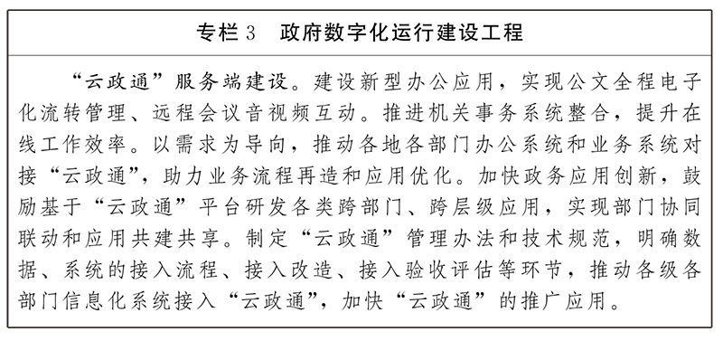 提升政務(wù)協(xié)同辦公數(shù)字化水平,構(gòu)建統(tǒng)一的政務(wù)協(xié)同辦公平臺“云政通”,支持各地各部門網(wǎng)上辦文、辦事,服務(wù)跨部門、跨層級遠(yuǎn)程辦會,提供政務(wù)服務(wù)事項(xiàng)的集中處理、協(xié)同審批及統(tǒng)一效能監(jiān)管服務(wù)。提升決策指揮數(shù)字化水平,加快政務(wù)應(yīng)用創(chuàng)新,支持基于“云政通”平臺研發(fā)各類跨部門、跨層級應(yīng)用,實(shí)現(xiàn)部門協(xié)同聯(lián)動和應(yīng)用共建共享。建立完善以匯聚數(shù)據(jù)為基礎(chǔ)的部門間數(shù)據(jù)共享應(yīng)用機(jī)制,建設(shè)政務(wù)數(shù)據(jù)共享交換平臺,大力推進(jìn)部門通過平臺獲取共享數(shù)據(jù),促進(jìn)業(yè)務(wù)協(xié)同和流程優(yōu)化,減少數(shù)據(jù)重復(fù)采集,減輕群眾和基層信息負(fù)擔(dān)。分級構(gòu)建決策指揮系統(tǒng),強(qiáng)化政府科學(xué)決策輔助能力,探索研發(fā)決策執(zhí)行模擬系統(tǒng),圍繞規(guī)劃布局、經(jīng)濟(jì)調(diào)控、應(yīng)急指揮等構(gòu)建分析模型,優(yōu)化決策的合理性和精準(zhǔn)性。提升行政監(jiān)督數(shù)字化水平,建設(shè)紀(jì)檢監(jiān)察、巡視巡察、行政執(zhí)法監(jiān)督、審計(jì)等問題整改動態(tài)監(jiān)管平臺,推進(jìn)問題發(fā)現(xiàn)與整改的全過程閉環(huán)可控,實(shí)現(xiàn)行政行為全程留痕留印、風(fēng)險(xiǎn)可控和過往可溯。