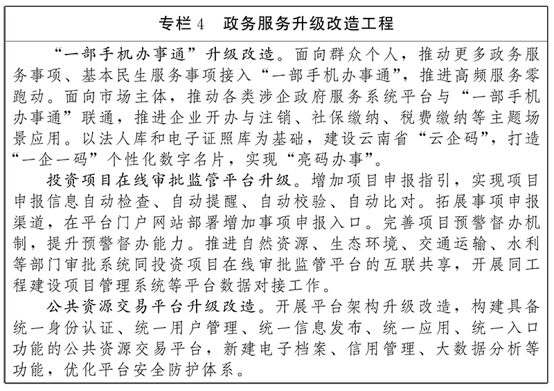 通過與云南人社12333、“一部手機(jī)辦稅費(fèi)”等各地各部門移動端業(yè)務(wù)系統(tǒng)對接聯(lián)通,將“一部手機(jī)辦事通”升級打造成為群眾和市場主體提供一站式移動服務(wù)的總門戶,提升面向個(gè)人、市場主體的政務(wù)服務(wù)水平。圍繞人民群眾日常關(guān)切的水電氣網(wǎng)辦理繳費(fèi)以及就醫(yī)、社區(qū)服務(wù)等民生熱點(diǎn),推動服務(wù)流程再優(yōu)化、填報(bào)材料再精簡。以市場主體獲得感與滿意度為導(dǎo)向,全面梳理跨部門、跨層級涉企服務(wù)事項(xiàng),打造企業(yè)集成套餐服務(wù),進(jìn)一步歸并、簡化辦理流程,推動材料并表、流程并行、審批并聯(lián),并通過可信身份認(rèn)證、電子證照、數(shù)據(jù)共享等措施,強(qiáng)化全省在線辦理和聯(lián)合辦理能力,政務(wù)服務(wù)高頻辦理事項(xiàng)實(shí)現(xiàn)“辦事不求人、審批不見面、最多跑一次”。