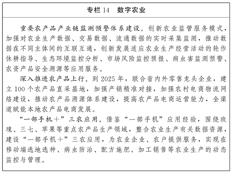 引導(dǎo)數(shù)字技術(shù)在農(nóng)業(yè)生產(chǎn)全過程的廣泛應(yīng)用,推進(jìn)農(nóng)業(yè)土壤、氣候、產(chǎn)業(yè)分布等各類數(shù)據(jù)在一張圖上疊加,實(shí)現(xiàn)農(nóng)產(chǎn)品的全生命周期數(shù)據(jù)共享。鼓勵(lì)企業(yè)發(fā)展茶葉、花卉、水果、蔬菜、堅(jiān)果、咖啡、中藥材、肉牛等數(shù)字化農(nóng)業(yè)特色應(yīng)用,建設(shè)一批農(nóng)業(yè)農(nóng)村信息化示范基地、智慧農(nóng)業(yè)產(chǎn)業(yè)園區(qū)、智慧農(nóng)場、農(nóng)業(yè)智慧物流配送中心等。大力發(fā)展農(nóng)村電商,建立綠色農(nóng)產(chǎn)品線上銷售、供應(yīng)鏈協(xié)同、防偽追溯等體系,推動種植、養(yǎng)殖、采購、銷售到追溯全鏈條數(shù)字化升級,全面提升農(nóng)業(yè)生產(chǎn)、加工、銷售各環(huán)節(jié)附加值。支持企業(yè)創(chuàng)新合作模式,補(bǔ)齊農(nóng)戶使用數(shù)字技術(shù)短板,持續(xù)拓展農(nóng)產(chǎn)品銷售市場,充分挖掘農(nóng)產(chǎn)品價(jià)值,帶動農(nóng)民增收致富。
