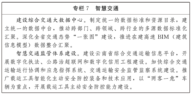 打造智慧交通綜合管理體系。推動交通基礎(chǔ)設(shè)施與交通感知網(wǎng)絡(luò)、通信網(wǎng)絡(luò)同步建設(shè),推進(jìn)高速公路、機(jī)場、車站等智慧化改造。打造綜合交通運(yùn)輸運(yùn)行協(xié)調(diào)和應(yīng)急指揮體系,與公路經(jīng)營管理單位通信指揮系統(tǒng)、路政應(yīng)急處置系統(tǒng)、公安交警指揮調(diào)度系統(tǒng)的對接,實(shí)現(xiàn)“一路多方”的交通運(yùn)行監(jiān)測和應(yīng)急協(xié)同應(yīng)用,推動交通智能化應(yīng)急指揮體系閉環(huán)運(yùn)行。試點(diǎn)客運(yùn)電子票證、貨運(yùn)“一單制”等,持續(xù)優(yōu)化數(shù)字交通服務(wù)能力。積極開展車聯(lián)網(wǎng)、車路協(xié)同和無人駕駛等技術(shù)創(chuàng)新試點(diǎn)。推動昆明智慧交通區(qū)域輻射示范、保山城鄉(xiāng)一體化智慧交通體系示范、玉溪國家電子車牌試點(diǎn)城市等建設(shè),引領(lǐng)全省智慧交通快速發(fā)展。