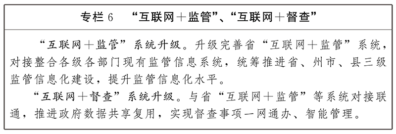 推進(jìn)“互聯(lián)網(wǎng)+監(jiān)管”建設(shè)。升級完善省“互聯(lián)網(wǎng)+監(jiān)管”系統(tǒng),建立健全監(jiān)管履職評估評價(jià)體系,實(shí)現(xiàn)監(jiān)管對象全覆蓋、監(jiān)管過程全記錄、監(jiān)管數(shù)據(jù)可共享可分析可預(yù)警,推動事中事后監(jiān)管標(biāo)準(zhǔn)化、規(guī)范化、精準(zhǔn)化。建立全省統(tǒng)一的執(zhí)法信息公示平臺,依法公開行政執(zhí)法職責(zé)、依據(jù)、程序、結(jié)果等,接受社會監(jiān)督。