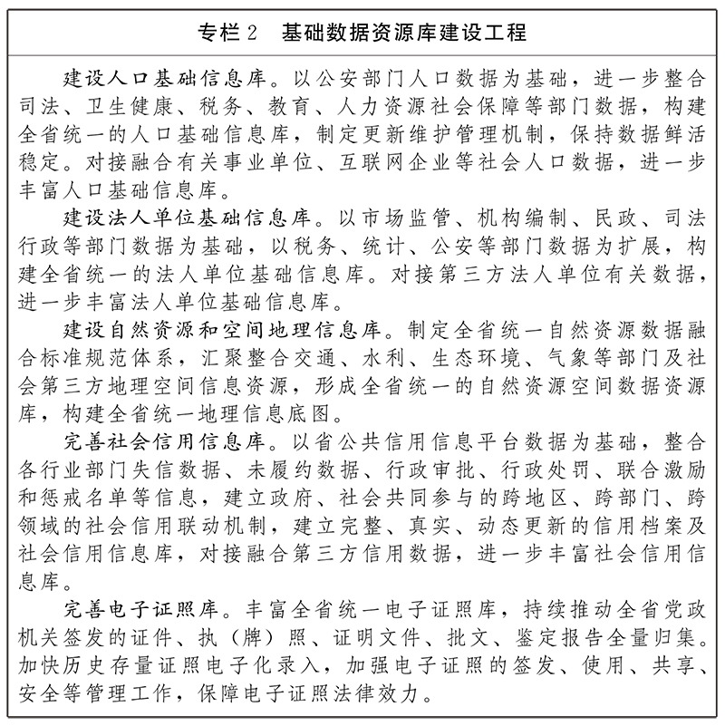 加快構(gòu)建并完善人口、法人、自然資源和空間地理、社會信用信息庫、電子證照庫等基礎(chǔ)庫以及各地各部門業(yè)務(wù)主題庫和有關(guān)專題庫,動態(tài)更新、疊加、關(guān)聯(lián)數(shù)據(jù),形成多維度的人、事、物信息體系。加快完善可信數(shù)據(jù)共享交換體系,建設(shè)統(tǒng)一的政務(wù)數(shù)據(jù)共享交換平臺、數(shù)據(jù)資源目錄,省直各部門已建、新建非涉密系統(tǒng)采用數(shù)據(jù)接口方式接入平臺,加快各類政務(wù)數(shù)據(jù)共享。建立全省統(tǒng)一數(shù)據(jù)標(biāo)準(zhǔn)和重點(diǎn)行業(yè)數(shù)據(jù)標(biāo)準(zhǔn),為數(shù)據(jù)治理、數(shù)據(jù)管理、數(shù)據(jù)分析等提供依據(jù)。落實(shí)數(shù)據(jù)質(zhì)量保障責(zé)任,建立數(shù)據(jù)質(zhì)量管理閉環(huán)。根據(jù)部門職責(zé)按需依法依規(guī)使用共享數(shù)據(jù),加強(qiáng)共享數(shù)據(jù)使用全過程管理。編制政務(wù)數(shù)據(jù)開放目錄,建設(shè)統(tǒng)一的政務(wù)數(shù)據(jù)開放平臺,向社會提供開放政務(wù)數(shù)據(jù)的查詢、下載、應(yīng)用接口等服務(wù),開展創(chuàng)新應(yīng)用。