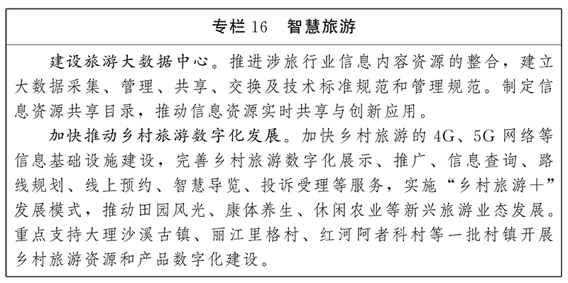 持續(xù)深化智慧旅游發(fā)展。持續(xù)優(yōu)化升級“一部手機(jī)游云南”,推進(jìn)文化和旅游綜合性服務(wù)體系建設(shè)。加快智慧旅游信息基礎(chǔ)設(shè)施建設(shè),在全省3A級以上旅游景區(qū)、星級賓館、旅游集中區(qū)、州市級公共文化服務(wù)場所實(shí)現(xiàn)智能導(dǎo)游、電子講解、刷臉認(rèn)證等服務(wù)全覆蓋,加快重點(diǎn)旅游核心區(qū)5G部署,打造“5G+智慧旅游”應(yīng)用。以大理古城、麗江古城、玉龍雪山等為重點(diǎn),打造全國智慧旅游景區(qū)樣板。打造租車、包車等智慧旅游交通出行服務(wù),打通景區(qū)交通“最后一公里”,推動省內(nèi)各大交通樞紐到重點(diǎn)旅游城市、景區(qū)的無縫對接、零距離換乘和高效接駁。加快建立智慧旅游標(biāo)準(zhǔn)體系和統(tǒng)計(jì)體系,搭建文化和旅游可視化綜合管理體系,實(shí)現(xiàn)市場綜合執(zhí)法、市場主體信用建設(shè)、游客投訴受理與處置等數(shù)字化服務(wù)管理。