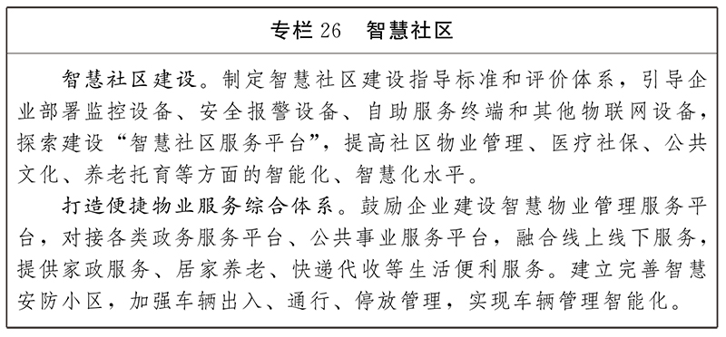 創(chuàng)新智慧社區(qū)服務(wù)。在有條件的社區(qū)開展網(wǎng)絡(luò)設(shè)施、智能終端等建設(shè),深化社區(qū)網(wǎng)格化數(shù)字管理模式應(yīng)用,持續(xù)完善在線矛盾糾紛多元化解平臺,有效提升基層矛盾化解能力。鼓勵(lì)社區(qū)服務(wù)企業(yè)打造便捷物業(yè)服務(wù)綜合體系,推動物業(yè)管理、家政服務(wù)等應(yīng)用創(chuàng)新,發(fā)展社區(qū)智慧養(yǎng)老托育等服務(wù)。打通物流配送“最后一公里”,發(fā)展快遞自提點(diǎn)、快遞超市、智能快遞箱等服務(wù)。