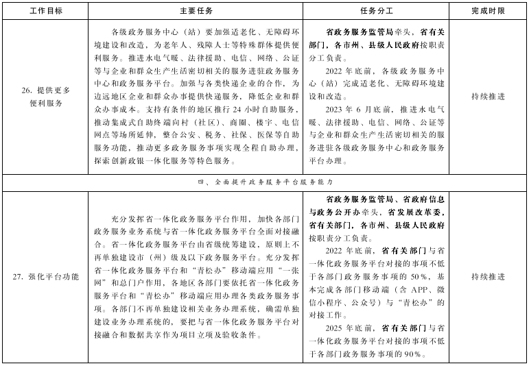 12.統(tǒng)一網(wǎng)上辦事入口。各部門要加強(qiáng)自建業(yè)務(wù)辦理系統(tǒng)、移動端應(yīng)用與省一體化政務(wù)服務(wù)平臺、“青松辦”移動端應(yīng)用的對接,形成統(tǒng)一架構(gòu)、規(guī)范管理、協(xié)同聯(lián)動的全省政務(wù)服務(wù)“一張網(wǎng)”,為企業(yè)和群眾辦事提供全省統(tǒng)一的一體化政務(wù)服務(wù)平臺和“青松辦”移動端辦事總門戶,實(shí)現(xiàn)網(wǎng)上辦事“一次注冊、一號登陸、多點(diǎn)互認(rèn)、全網(wǎng)通行”。(牽頭單位:省政務(wù)服務(wù)監(jiān)管局,各市州、縣級人民政府;責(zé)任單位:省有關(guān)部門;完成時限:2023年底前)
