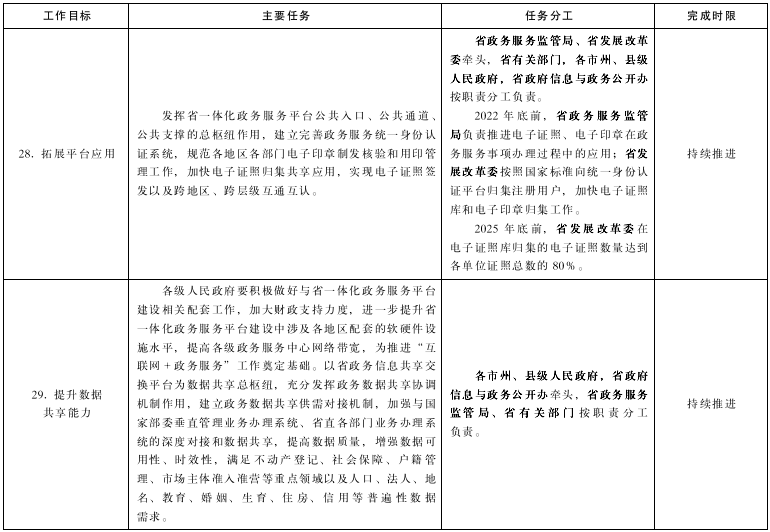 28.拓展平臺應(yīng)用。發(fā)揮省一體化政務(wù)服務(wù)平臺公共入口、公共通道、公共支撐的總樞紐作用,建立完善政務(wù)服務(wù)統(tǒng)一身份認(rèn)證系統(tǒng),規(guī)范各地區(qū)各部門電子印章制發(fā)核驗(yàn)和用印管理工作,加快電子證照歸集共享應(yīng)用,實(shí)現(xiàn)電子證照簽發(fā)以及跨地區(qū)、跨層級互通互認(rèn)。(牽頭單位:省政務(wù)服務(wù)監(jiān)管局、省發(fā)展改革委;責(zé)任單位:省有關(guān)部門,各市州、縣級人民政府,省政府信息與政務(wù)公開辦;完成時限:持續(xù)推進(jìn))