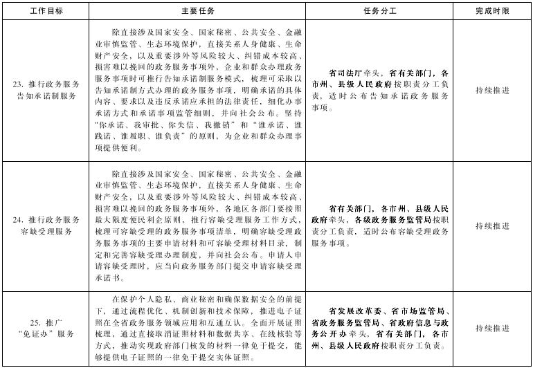 23.推行政務(wù)服務(wù)告知承諾制服務(wù)。除直接涉及國家安全、國家秘密、公共安全、金融業(yè)審慎監(jiān)管、生態(tài)環(huán)境保護(hù),直接關(guān)系人身健康、生命財(cái)產(chǎn)安全,以及重要涉外等風(fēng)險(xiǎn)較大、糾錯成本較高、損害難以挽回的政務(wù)服務(wù)事項(xiàng)外,企業(yè)和群眾辦理政務(wù)服務(wù)事項(xiàng)時可推行告知承諾制服務(wù)模式,梳理可采取以告知承諾制方式辦理的政務(wù)服務(wù)事項(xiàng),明確承諾的具體內(nèi)容、要求以及違反承諾應(yīng)承擔(dān)的法律責(zé)任,細(xì)化辦事承諾方式和承諾事項(xiàng)監(jiān)管細(xì)則,并向社會公布。堅(jiān)持“你承諾、我審批、你失信、我撤銷”和“誰承諾、誰踐諾、誰履職、誰負(fù)責(zé)”的原則,為企業(yè)和群眾辦理事項(xiàng)提供便利。(牽頭單位:省司法廳;責(zé)任單位:省有關(guān)部門,各市州、縣級人民政府;完成時限:持續(xù)推進(jìn))