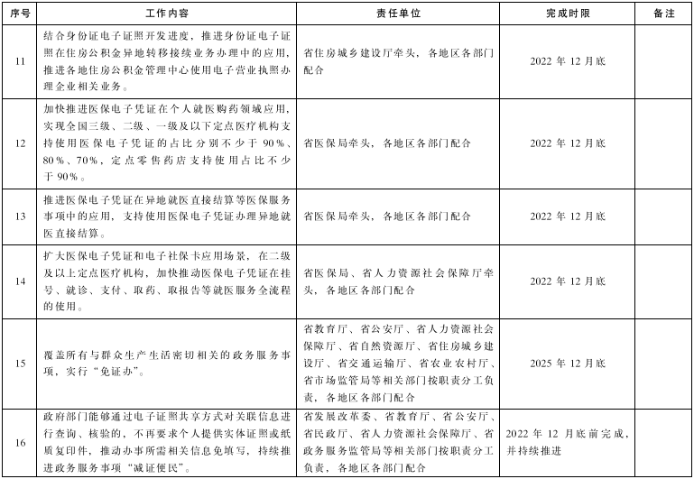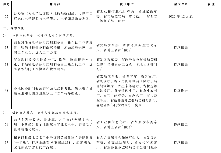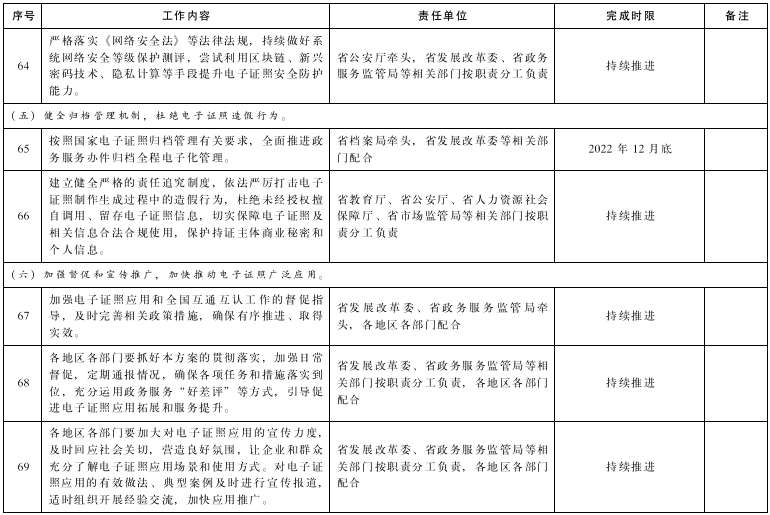 13.貫徹執(zhí)行國家電子證照標(biāo)準(zhǔn)規(guī)范。各部門按照國家電子證照有關(guān)標(biāo)準(zhǔn),加快標(biāo)準(zhǔn)實(shí)施,抓緊完成事業(yè)單位法人證書、社會(huì)組織登記證、經(jīng)營許可證、身份證、戶口簿、學(xué)歷學(xué)位證、出生醫(yī)學(xué)證明及常用職業(yè)資格證等存量證照標(biāo)準(zhǔn)化改造,全面支撐開展電子化應(yīng)用和全國互通互認(rèn)。(省委編辦、省發(fā)展改革委、省教育廳、省公安廳、省民政廳、省人力資源社會(huì)保障廳、省交通運(yùn)輸廳、省農(nóng)業(yè)農(nóng)村廳、省衛(wèi)生健康委、省應(yīng)急廳、省政務(wù)服務(wù)監(jiān)管局等相關(guān)部門,各市州政府按職責(zé)分工負(fù)責(zé))