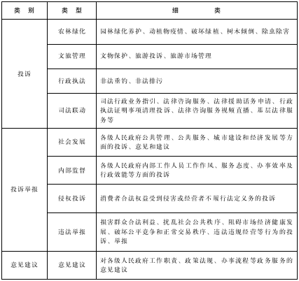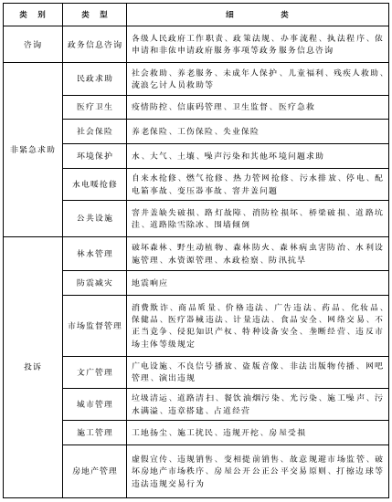 (1)涉及各級政府職能部門、公共服務(wù)部門工作職責(zé)、政策法規(guī)、辦事流程、執(zhí)法程序、行政審批及政務(wù)服務(wù)、公共服務(wù)事項等方面的咨詢、投訴、建議等。