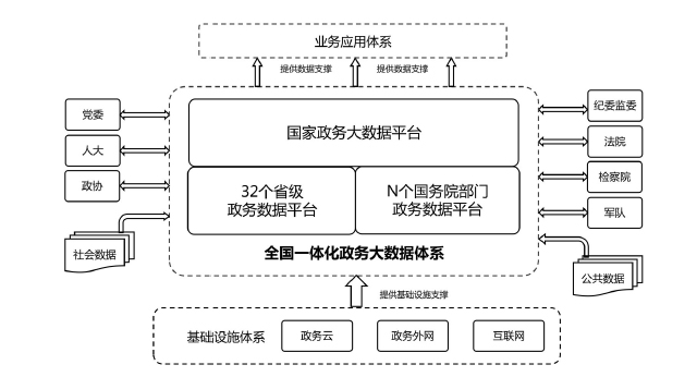 全國(guó)一體化政務(wù)大數(shù)據(jù)體系包括三類(lèi)平臺(tái)和三大支撐。三類(lèi)平臺(tái)為“1+32+N”框架結(jié)構(gòu)?!?”是指國(guó)家政務(wù)大數(shù)據(jù)平臺(tái),是我國(guó)政務(wù)數(shù)據(jù)管理的總樞紐、政務(wù)數(shù)據(jù)流轉(zhuǎn)的總通道、政務(wù)數(shù)據(jù)服務(wù)的總門(mén)戶;“32”是指31個(gè)?。ㄗ灾螀^(qū)、直轄市)和新疆生產(chǎn)建設(shè)兵團(tuán)統(tǒng)籌建設(shè)的省級(jí)政務(wù)數(shù)據(jù)平臺(tái),負(fù)責(zé)本地區(qū)政務(wù)數(shù)據(jù)的目錄編制、供需對(duì)接、匯聚整合、共享開(kāi)放,與國(guó)家平臺(tái)實(shí)現(xiàn)級(jí)聯(lián)對(duì)接;“N”是指國(guó)務(wù)院有關(guān)部門(mén)的政務(wù)數(shù)據(jù)平臺(tái),負(fù)責(zé)本部門(mén)本行業(yè)數(shù)據(jù)匯聚整合與供需對(duì)接,與國(guó)家平臺(tái)實(shí)現(xiàn)互聯(lián)互通,尚未建設(shè)政務(wù)數(shù)據(jù)平臺(tái)的部門(mén),可由國(guó)家平臺(tái)提供服務(wù)支撐。三大支撐包括管理機(jī)制、標(biāo)準(zhǔn)規(guī)范、安全保障三個(gè)方面。