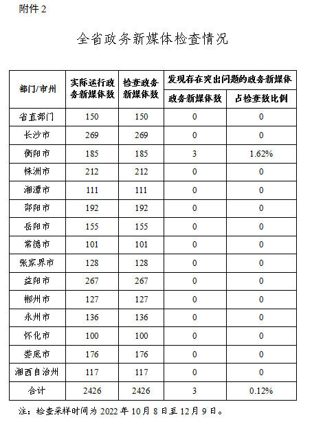 2022年第四季度,省政務局組織對全省正常運行的619家政府網站進行了全覆蓋檢查,無存在單項否決問題網站,總體合格率100%。對全省正常運行的2426家政務新媒體進行了普查,發(fā)現(xiàn)3家存在突出問題,總體合格率99.88%。長沙市、株洲市、湘潭市、邵陽市、岳陽市、常德市、張家界市、益陽市、郴州市、永州市、懷化市、婁底市、湘西自治州政府網站和政務新媒體檢查合格率均達到100%。