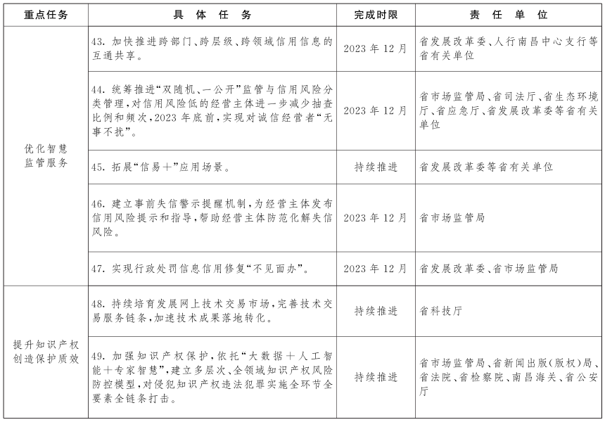 十一、提升知識(shí)產(chǎn)權(quán)創(chuàng)造保護(hù)質(zhì)效。持續(xù)培育發(fā)展網(wǎng)上技術(shù)交易市場(chǎng),完善技術(shù)交易服務(wù)鏈條,加速技術(shù)成果落地轉(zhuǎn)化。加強(qiáng)知識(shí)產(chǎn)權(quán)保護(hù),依托“大數(shù)據(jù)+人工智能+專家智慧”,建立多層次、全領(lǐng)域知識(shí)產(chǎn)權(quán)風(fēng)險(xiǎn)防控模型,對(duì)侵犯知識(shí)產(chǎn)權(quán)違法犯罪實(shí)施全環(huán)節(jié)全要素全鏈條打擊。(責(zé)任單位:省市場(chǎng)監(jiān)管局、省科技廳、省新聞出版〔版權(quán)〕局、省法院、省檢察院、南昌海關(guān)、省公安廳)