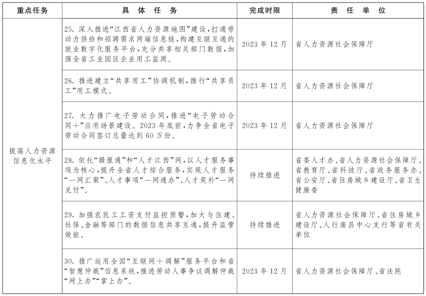 六、提高人力資源信息化水平。深入推進(jìn)“江西省人力資源地圖”建設(shè),構(gòu)建互聯(lián)互通的就業(yè)數(shù)字化服務(wù)平臺(tái),加強(qiáng)工業(yè)園區(qū)企業(yè)用工監(jiān)測(cè)。推進(jìn)建立“共享用工”協(xié)調(diào)機(jī)制,推行“共享員工”用工模式。大力推廣電子勞動(dòng)合同,推進(jìn)“電子勞動(dòng)合同+”應(yīng)用場(chǎng)景建設(shè)。依托“贛服通”和“人才江西”網(wǎng),以人才服務(wù)事項(xiàng)為核心,提升全省人才綜合服務(wù),實(shí)現(xiàn)人才服務(wù)“一網(wǎng)匯聚”、人才事項(xiàng)“一網(wǎng)通辦”、人才獎(jiǎng)補(bǔ)“一網(wǎng)兌付”。加強(qiáng)農(nóng)民工工資支付監(jiān)控預(yù)警,保障農(nóng)民工合法權(quán)益。推廣運(yùn)用全國(guó)“互聯(lián)網(wǎng)+調(diào)解”服務(wù)平臺(tái)和省“智慧仲裁”信息系統(tǒng),推進(jìn)勞動(dòng)人事?tīng)?zhēng)議調(diào)解仲裁“網(wǎng)上辦”“掌上辦”。(責(zé)任單位:省人力資源社會(huì)保障廳、省委人才辦、省法院、省教育廳、省科技廳、省政務(wù)服務(wù)辦、省公安廳、省衛(wèi)生健康委、省住房城鄉(xiāng)建設(shè)廳、人行南昌中心支行等省有關(guān)單位)