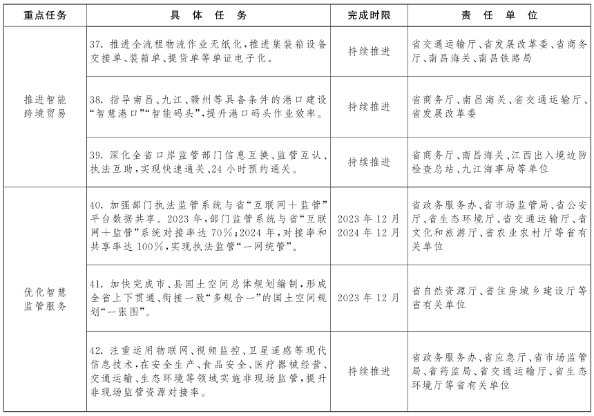 九、推進(jìn)智能跨境貿(mào)易。推動(dòng)國(guó)際貿(mào)易“單一窗口”服務(wù)功能由口岸通關(guān)向口岸物流、貿(mào)易服務(wù)等全鏈條拓展。推進(jìn)全流程物流作業(yè)無(wú)紙化。指導(dǎo)南昌、九江、贛州等具備條件的港口建設(shè)“智慧港口”“智能碼頭”,提升港口碼頭作業(yè)效率。深化全省口岸監(jiān)管部門信息互換、監(jiān)管互認(rèn)、執(zhí)法互助,實(shí)現(xiàn)快速通關(guān)、24小時(shí)預(yù)約通關(guān)。(責(zé)任單位:省商務(wù)廳、南昌海關(guān)、省交通運(yùn)輸廳、省發(fā)展改革委、省公安廳、省工業(yè)和信息化廳、省自然資源廳、省生態(tài)環(huán)境廳、省農(nóng)業(yè)農(nóng)村廳、省科技廳、省市場(chǎng)監(jiān)管局、省林業(yè)局、省廣播電視局、省新聞出版〔版權(quán)〕局、省稅務(wù)局、人行南昌中心支行、省貿(mào)促會(huì)、南昌鐵路局、江西出入境邊防檢查總站、九江海事局)
