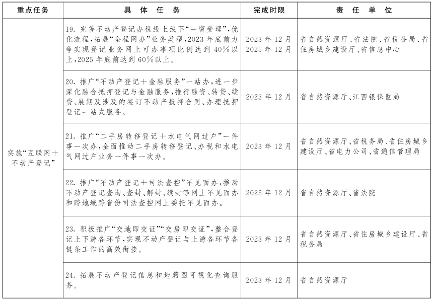 五、實(shí)施“互聯(lián)網(wǎng)+不動(dòng)產(chǎn)登記”。完善不動(dòng)產(chǎn)登記辦稅線上線下“一窗受理”,優(yōu)化流程,拓展“全程網(wǎng)辦”業(yè)務(wù)類型。推廣“不動(dòng)產(chǎn)登記+金融服務(wù)”一站辦、“二手房轉(zhuǎn)移登記+水電氣網(wǎng)過(guò)戶”一件事一次辦、“不動(dòng)產(chǎn)登記+司法查控”不見(jiàn)面辦。積極推廣“交地即交證”“交房即交證”。拓展不動(dòng)產(chǎn)登記信息和地籍圖可視化查詢服務(wù)。(責(zé)任單位:省自然資源廳、省住房城鄉(xiāng)建設(shè)廳、省稅務(wù)局、江西銀保監(jiān)局、省法院、省電力公司、省通信管理局、省信息中心)