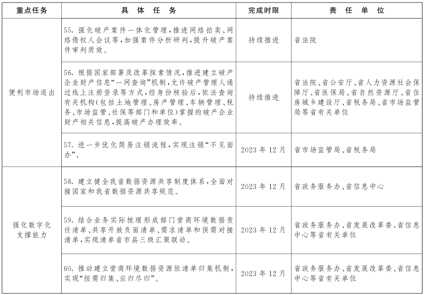 十四、便利市場(chǎng)退出。強(qiáng)化破產(chǎn)案件一體化管理,推進(jìn)網(wǎng)絡(luò)拍賣、網(wǎng)絡(luò)債權(quán)人會(huì)議等,加強(qiáng)案件分析研判,提升破產(chǎn)案件審判質(zhì)效。探索建立破產(chǎn)企業(yè)財(cái)產(chǎn)信息“一網(wǎng)查詢”機(jī)制,便利破產(chǎn)管理人線上查詢。進(jìn)一步優(yōu)化簡(jiǎn)易注銷流程,實(shí)現(xiàn)注銷“不見(jiàn)面辦”。(責(zé)任單位:省法院、省自然資源廳、省住房城鄉(xiāng)建設(shè)廳、省公安廳、省稅務(wù)局、省市場(chǎng)監(jiān)管局、省人力資源社會(huì)保障廳、省醫(yī)保局等省有關(guān)單位)