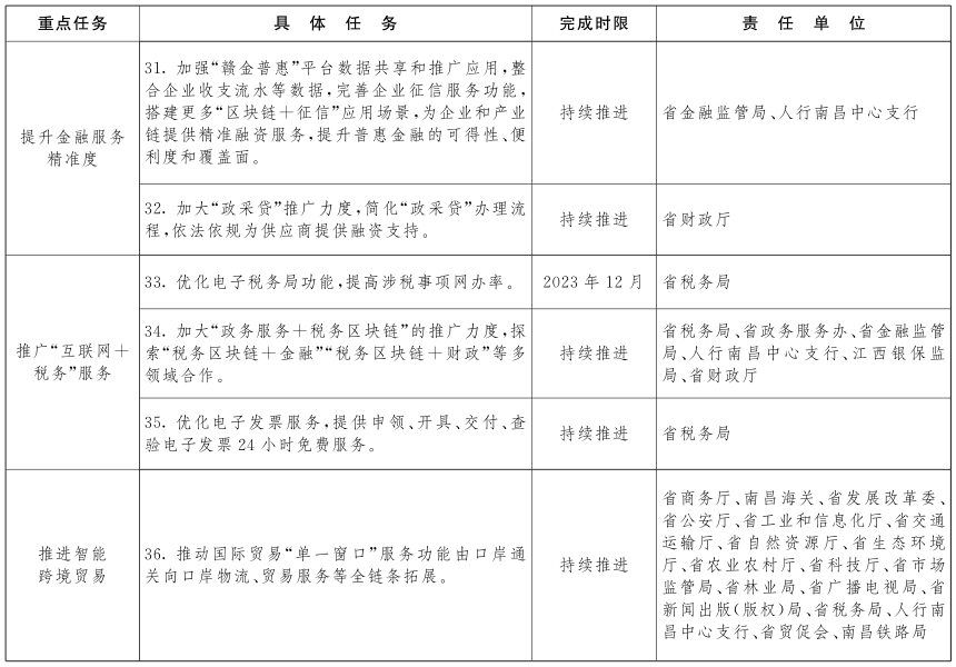 八、推廣“互聯(lián)網(wǎng)+稅務(wù)”服務(wù)。優(yōu)化電子稅務(wù)局功能,提高涉稅事項(xiàng)網(wǎng)辦率。加大“政務(wù)服務(wù)+稅務(wù)區(qū)塊鏈”推廣力度,探索“稅務(wù)區(qū)塊鏈+金融”“稅務(wù)區(qū)塊鏈+財(cái)政”等多領(lǐng)域合作。優(yōu)化電子發(fā)票服務(wù),提供申領(lǐng)、開(kāi)具、交付、查驗(yàn)電子發(fā)票24小時(shí)免費(fèi)服務(wù)。(責(zé)任單位:省稅務(wù)局、省政務(wù)服務(wù)辦、省金融監(jiān)管局、人行南昌中心支行、江西銀保監(jiān)局、省財(cái)政廳)