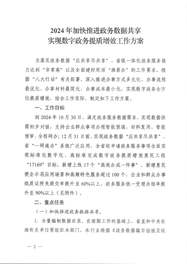 湖南省人民政府辦公廳關(guān)于印發(fā)〈2024年加快推進政務(wù)數(shù)據(jù)共享實現(xiàn)數(shù)字政務(wù)提質(zhì)增效工作方案〉的通知
