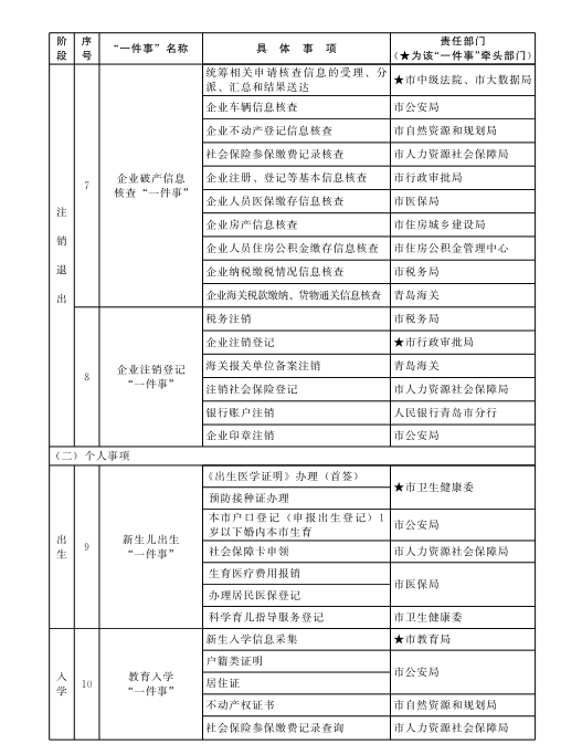 ?。ǘ┥罨?wù)服務(wù)模式創(chuàng)新。推進(jìn)關(guān)聯(lián)事項(xiàng)集成辦,全面落實(shí)國(guó)務(wù)院首批“高效辦成一件事”重點(diǎn)事項(xiàng),高質(zhì)量完成企業(yè)注銷登記、教育入學(xué)、殘疾人服務(wù)3個(gè)國(guó)家確定創(chuàng)新示范“一件事”,逐個(gè)建立“一個(gè)牽頭部門、一個(gè)工作團(tuán)隊(duì)、一套工作方案”運(yùn)行機(jī)制。(責(zé)任單位:市委金融辦、市中級(jí)法院、市發(fā)展改革委、市教育局、市人力資源社會(huì)保障局、市交通運(yùn)輸局、市衛(wèi)生健康委、市大數(shù)據(jù)局、市行政審批局、市殘聯(lián))鼓勵(lì)各區(qū)(市)各部門從實(shí)際出發(fā)改革創(chuàng)新、大膽探索,不斷拓展新的服務(wù)場(chǎng)景,推出具有青島特色的“一件事”。推進(jìn)容缺事項(xiàng)承諾辦,以政務(wù)服務(wù)部門清楚告知、企業(yè)和群眾誠(chéng)信守諾為基礎(chǔ),對(duì)風(fēng)險(xiǎn)可控、糾錯(cuò)成本低且能夠通過(guò)事中事后監(jiān)管有效防范風(fēng)險(xiǎn)的政務(wù)服務(wù)事項(xiàng),推行“告知承諾+容缺辦理”審批服務(wù)模式。(責(zé)任單位:各政務(wù)服務(wù)部門)持續(xù)落實(shí)政務(wù)服務(wù)事項(xiàng)省內(nèi)通辦、跨省通辦,依托線下代收代辦服務(wù)模式,按需開設(shè)遠(yuǎn)程虛擬窗口,做到就近辦、異地辦。(責(zé)任單位:市行政審批局、市大數(shù)據(jù)局)
