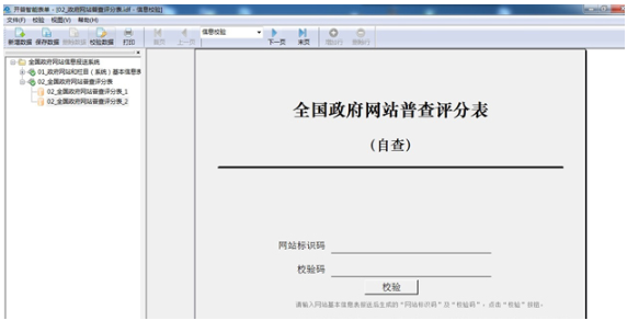 填報(bào)單位打開客戶端軟件,選取“全國(guó)政府網(wǎng)站普查評(píng)分表”并新建數(shù)據(jù),首先輸入“網(wǎng)站標(biāo)識(shí)碼”和“校驗(yàn)碼”,通過驗(yàn)證后,填寫該網(wǎng)站的自查評(píng)分信息并保存。