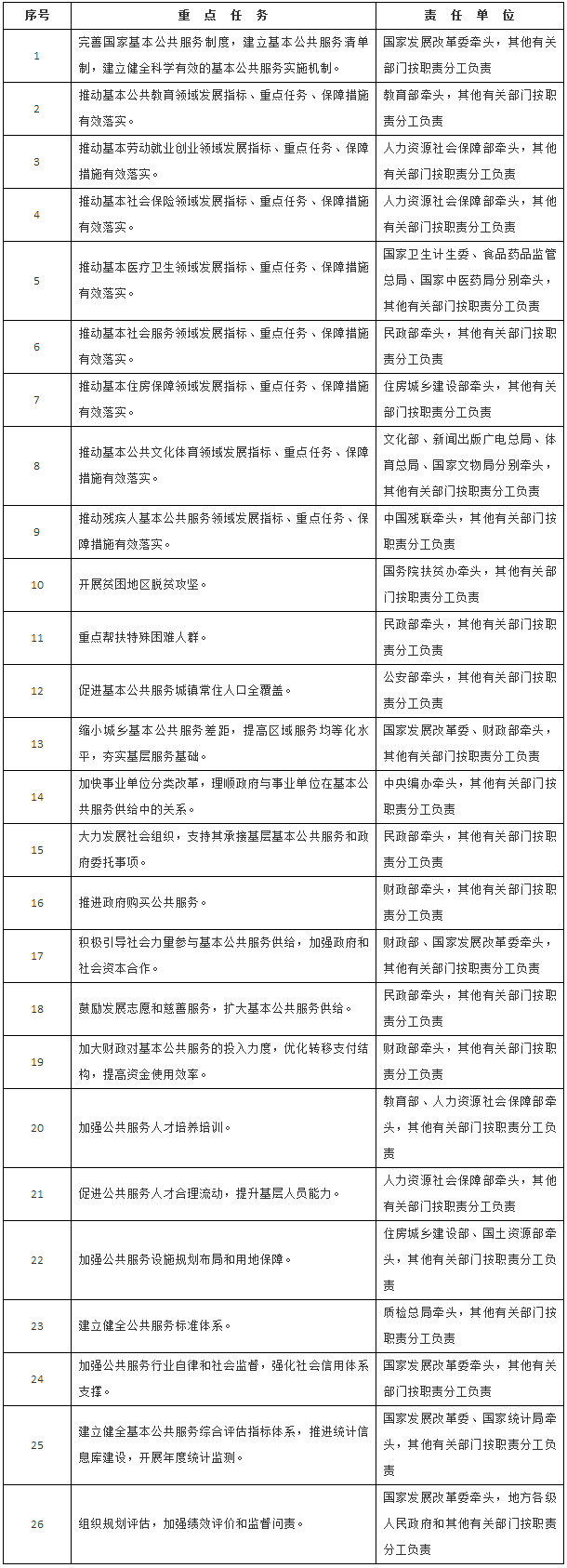 國(guó)家建立基本公共服務(wù)清單制,依據(jù)現(xiàn)行法律法規(guī)和相關(guān)政策確定基本公共服務(wù)主要領(lǐng)域,以及各領(lǐng)域具體服務(wù)項(xiàng)目和國(guó)家基本標(biāo)準(zhǔn),向社會(huì)公布,作為政府履行職責(zé)和公民享有相應(yīng)權(quán)利的依據(jù)?!丁笆濉眹?guó)家基本公共服務(wù)清單》(以下簡(jiǎn)稱《清單》,詳見(jiàn)附件1)包括公共教育、勞動(dòng)就業(yè)創(chuàng)業(yè)、社會(huì)保險(xiǎn)、醫(yī)療衛(wèi)生、社會(huì)服務(wù)、住房保障、公共文化體育、殘疾人服務(wù)等八個(gè)領(lǐng)域的81個(gè)項(xiàng)目。每個(gè)項(xiàng)目均明確服務(wù)對(duì)象、服務(wù)指導(dǎo)標(biāo)準(zhǔn)、支出責(zé)任、牽頭負(fù)責(zé)單位等。其中,服務(wù)對(duì)象是指各項(xiàng)目所面向的受眾人群;服務(wù)指導(dǎo)標(biāo)準(zhǔn)是指各項(xiàng)目的保障水平、覆蓋范圍、實(shí)現(xiàn)程度等;支出責(zé)任是指各項(xiàng)目的籌資主體及承擔(dān)責(zé)任;牽頭負(fù)責(zé)單位是指國(guó)家層面的主要負(fù)責(zé)單位,具體落實(shí)由地方各級(jí)人民政府及有關(guān)部門、單位按職責(zé)分工負(fù)責(zé)。