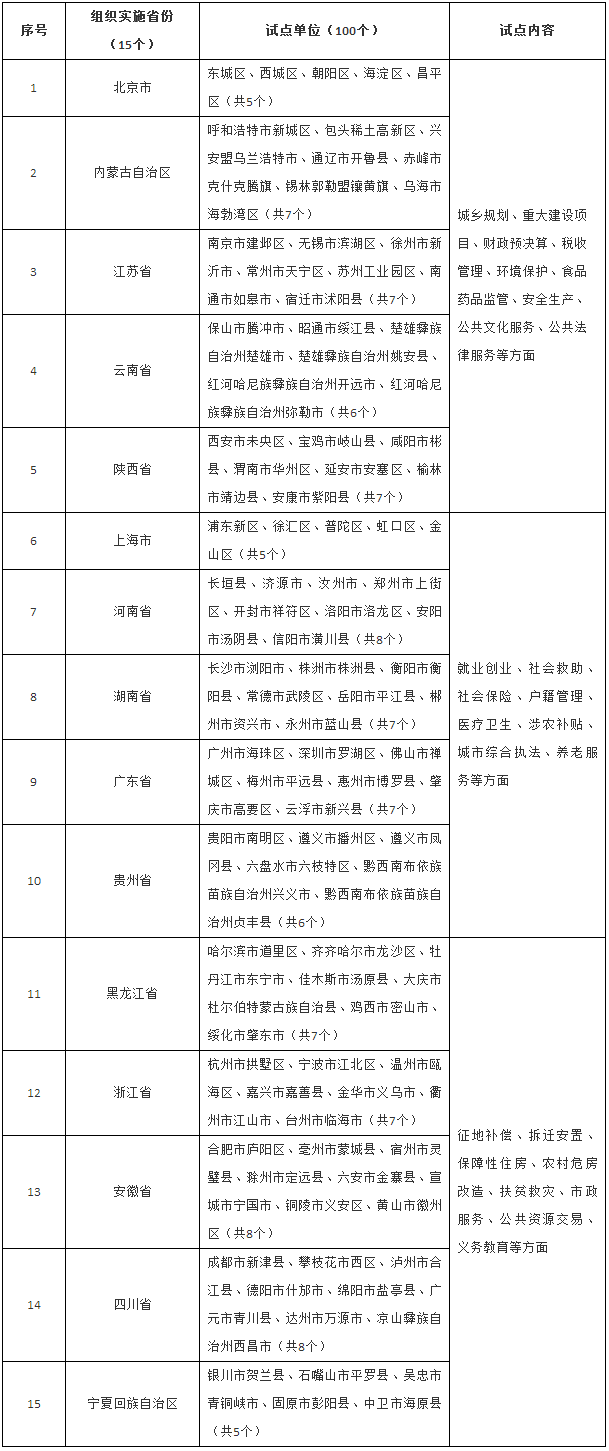 根據(jù)各地區(qū)實(shí)際情況和政務(wù)公開工作基礎(chǔ),確定在北京市、安徽省、陜西省等15個(gè)?。▍^(qū)、市)的100個(gè)縣(市、區(qū))(以下稱試點(diǎn)單位),重點(diǎn)圍繞城鄉(xiāng)規(guī)劃、重大建設(shè)項(xiàng)目、公共資源交易、財(cái)政預(yù)決算、安全生產(chǎn)、稅收管理、征地補(bǔ)償、拆遷安置、保障性住房、農(nóng)村危房改造、環(huán)境保護(hù)、公共文化服務(wù)、公共法律服務(wù)、扶貧救災(zāi)、食品藥品監(jiān)管、城市綜合執(zhí)法、就業(yè)創(chuàng)業(yè)、社會(huì)保險(xiǎn)、社會(huì)救助、養(yǎng)老服務(wù)、戶籍管理、涉農(nóng)補(bǔ)貼、義務(wù)教育、醫(yī)療衛(wèi)生、市政服務(wù)等方面開展試點(diǎn)工作(《試點(diǎn)單位及試點(diǎn)內(nèi)容表》附后)。承擔(dān)試點(diǎn)任務(wù)的?。▍^(qū)、市)在做好試點(diǎn)工作的同時(shí),可以結(jié)合實(shí)際適當(dāng)增加試點(diǎn)內(nèi)容。