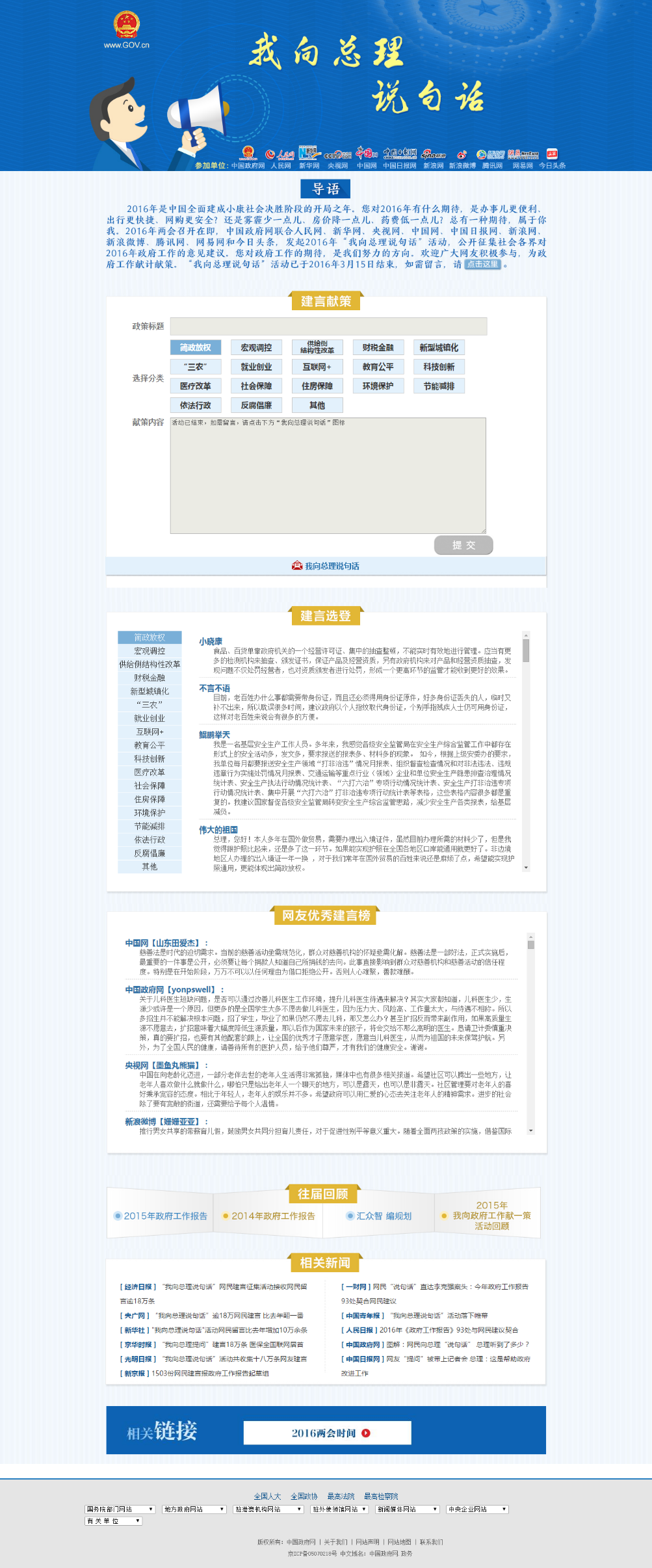 從"市長熱線"、領(lǐng)導(dǎo)信箱、留言板再到官員博客、政務(wù)微信、政務(wù)微博,政民互動方式隨著互聯(lián)網(wǎng)應(yīng)用、模式的變遷發(fā)生了深刻變化,在互動形式、主要議題、參與主體、輿情影響等方面都呈現(xiàn)出階段性特色,基于政府網(wǎng)站平臺為核心,網(wǎng)絡(luò)新聞媒體、社交平臺、新聞客戶端等的融入使政民互動通道日趨走向社會化。2016年1月31日,中國政府網(wǎng)聯(lián)合人民網(wǎng)、新華網(wǎng)、中國日報(bào)網(wǎng)、中國網(wǎng)、央視網(wǎng)、新浪網(wǎng)、新浪微博、網(wǎng)易網(wǎng)、騰訊網(wǎng)、今日頭條等11家網(wǎng)絡(luò)媒體,聯(lián)合開展"我向總理說句話"網(wǎng)民建言征集活動。從那天起,類似這樣的建言就開始通過電腦、手機(jī)呈現(xiàn)在網(wǎng)絡(luò)上。"我向總理說句話"已經(jīng)成為網(wǎng)民的關(guān)注熱點(diǎn)。