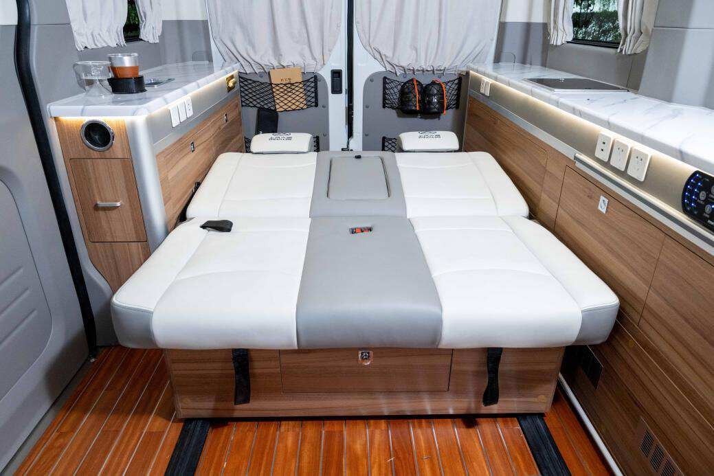 到了晚上,將上汽大通MAXUS V90露營(yíng)版的乘客區(qū)雙人座椅調(diào)節(jié)至90度全傾倒,就變成了一張舒適的臥榻。拉上隱私窗簾、打開(kāi)小夜燈,在寧?kù)o的夜晚,伴隨著星星點(diǎn)點(diǎn)入睡,第二天再開(kāi)啟美好旅程。