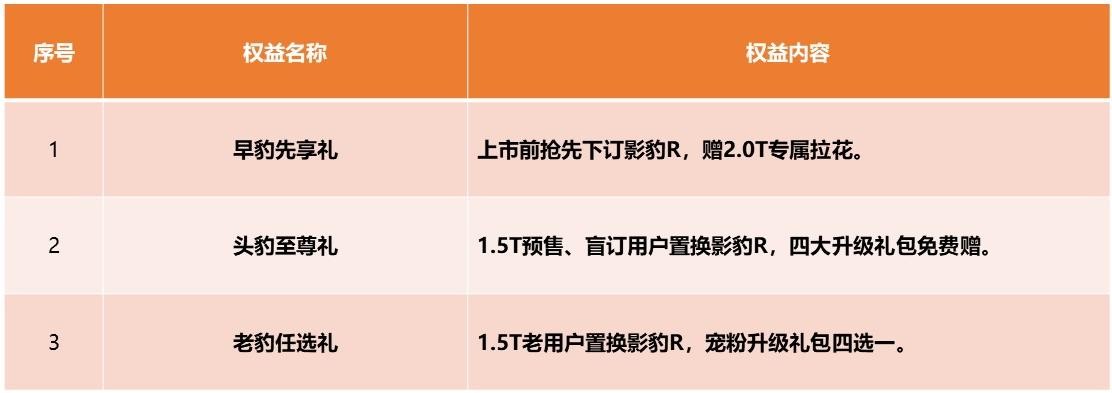 第三類是其他影豹1.5T老客戶,派發(fā)“老豹任選禮”,享受“外飾+內飾+智能+性能”權益禮包,四大置換升級禮包任選一,美美收下實實在在的福利,這樣的羊毛不薅白不薅。