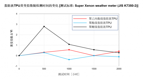 圖2:脂肪族TPU黃變指數(shù)隨檢測(cè)時(shí)間變化