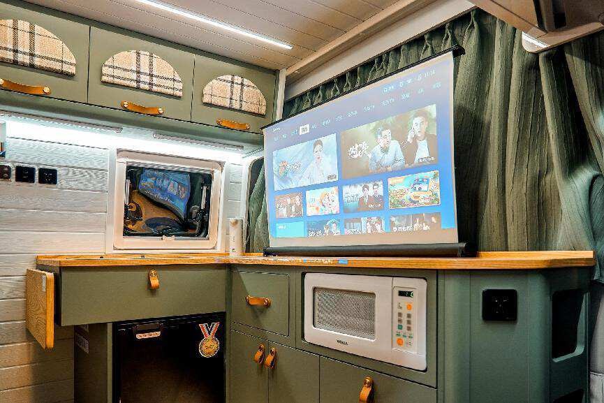 上汽大通MAXUS旅行家RVLIFE露營(yíng)版不僅是一個(gè)交通工具,也是一個(gè)“移動(dòng)的家”。車內(nèi)生活區(qū)配備了集成50升冰箱、微波爐、飲水機(jī)等家電的一體式櫥柜,可以將飲品與食物放置于此,滿足旅途中的口腹之欲。同時(shí),車內(nèi)還配置了投影娛樂設(shè)備,帶來沉浸式的觀影體驗(yàn),讓我們可以毫無顧慮地感受生活的美好。