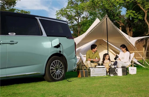 值得一提的是,大家MIFA9支持雙向充放電,除了直流快充+交流慢充,還自帶V2L外放電功能(6.6kW),即便你攜家人在戶外露營,亦可用電無憂。舉個(gè)例子,你可以用它給烤箱、咖啡機(jī)等供電,為全家出游增添更多樂趣。