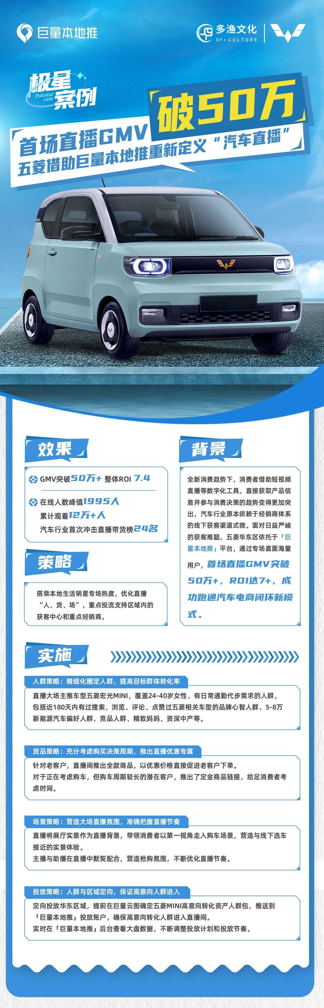 依托于「巨量本地推」平臺,通過搭乘本地生活明星專場熱度,在抖音平臺直播售賣整車和定金等商品套餐,并投流支持區(qū)域內(nèi)的獲客中心和重點經(jīng)銷商。期間克服了經(jīng)銷商缺乏大場直播經(jīng)驗、行業(yè)缺乏團購商品直播經(jīng)驗以及籌備時間不足等困難,成為汽車行業(yè)首個本地生服團購【巨量本地推】直播案例,實現(xiàn)首場直播GMV突破50萬,ROI達7+的戰(zhàn)績,成功跑通汽車電商新模式。如此引人矚目的成績是如何達成的呢?巨量本地推總結(jié)了五菱華東區(qū)的專場直播策略,一起來看看吧!