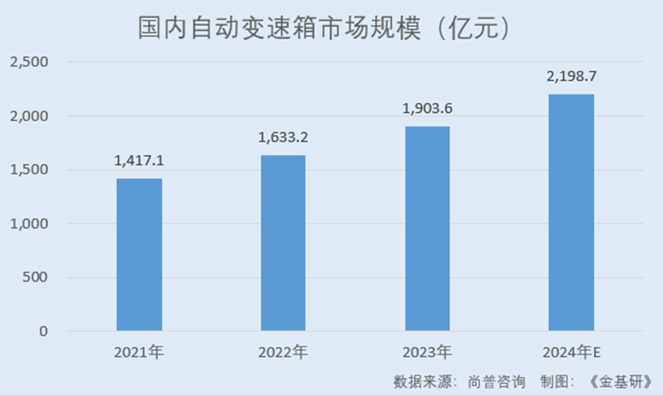 據尚普咨詢數據,2021-2023年,國內自動變速箱市場規(guī)模分別為1,417.1億元、1,633.2億元、1,903.6億元,預計2024年將達到2,198.7億元。