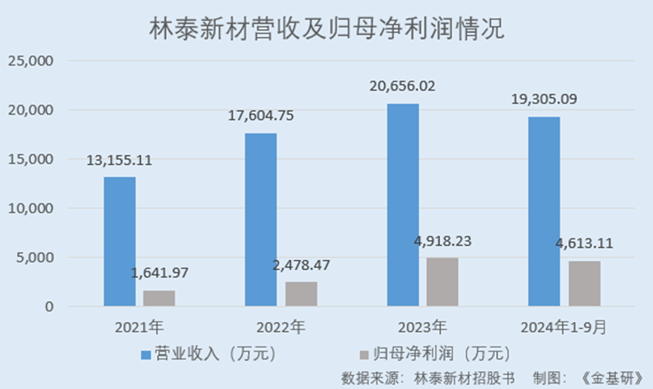 據招股書,2021-2023年,林泰新材營業(yè)收入分別為1.32億元、1.76億元、2.07億元,年均復合增長率為25.31%。同期,林泰新材的歸母凈利潤分別為1,641.97萬元、2,478.47萬元、4,918.23萬元,年均復合增長率達73.07%。