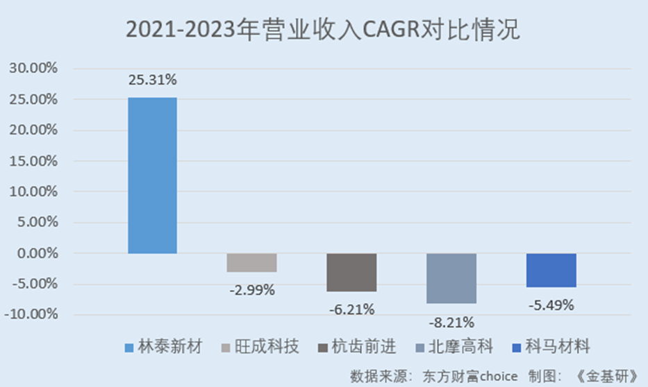 據東方財富choice數據,2021-2023年,林泰新材同行業(yè)可比公司重慶市旺成科技股份有限公司(以下簡稱“旺成科技”)、杭州前進齒輪箱集團股份有限公司(以下簡稱“杭齒前進”)、北京北摩高科摩擦材料股份有限公司(以下簡稱“北摩高科”)、浙江科馬摩擦材料股份有限公司(以下簡稱“科馬材料”)的營收CAGR分別為-2.99%、-6.21%、-8.21%、-5.49%;歸母凈利潤CAGR分別為1.79%、18.75%、-28.25%、-17.32%。