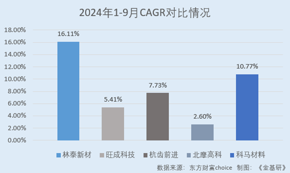 同期,林泰新材的ROE分別為10.03%、12.75%、20.61%、16.11%。其中,2024年1-9月,林泰新材同行業(yè)可比公司旺成科技的ROE為5.41%;杭齒前進的ROE為7.73%;北摩高科的ROE為2.60%;科馬材料的ROE為10.77%。