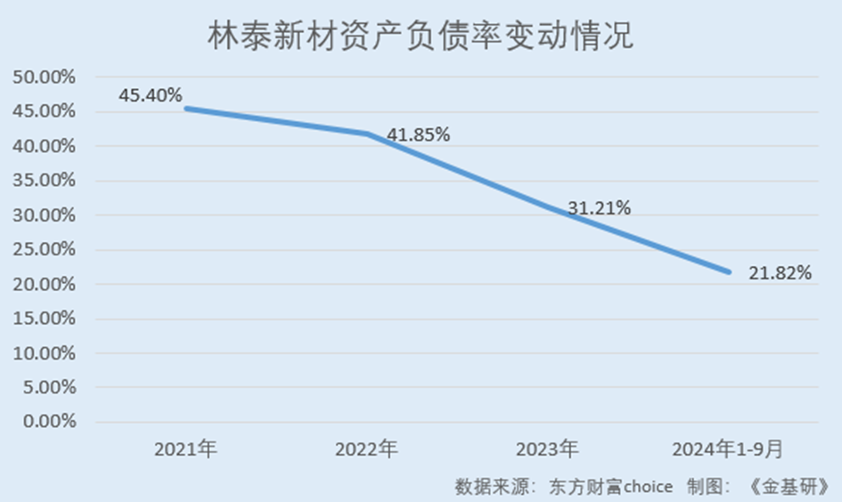 另一方面,近年來林泰新材的資產負債率呈逐年下降趨勢,償債能力增強。據東方財富choice數據,2021-2023年及2024年1-9月,林泰新材的資產負債率分別為45.40%、41.85%、31.21%、21.82%。