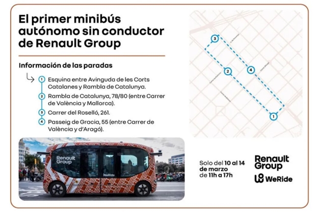 經(jīng)巴塞羅那市政廳與西班牙交通總局(Directorate General of Traffic, DGT)授權(quán)許可,本次文遠小巴試運營服務(wù)將于3月10日至14日,每天11:00-17:00向公眾開放,運營環(huán)線超2公里,沿途設(shè)置 4 個上下車站點,線路途經(jīng)巴塞羅那巴特羅之家和米拉之家等地標性建筑。