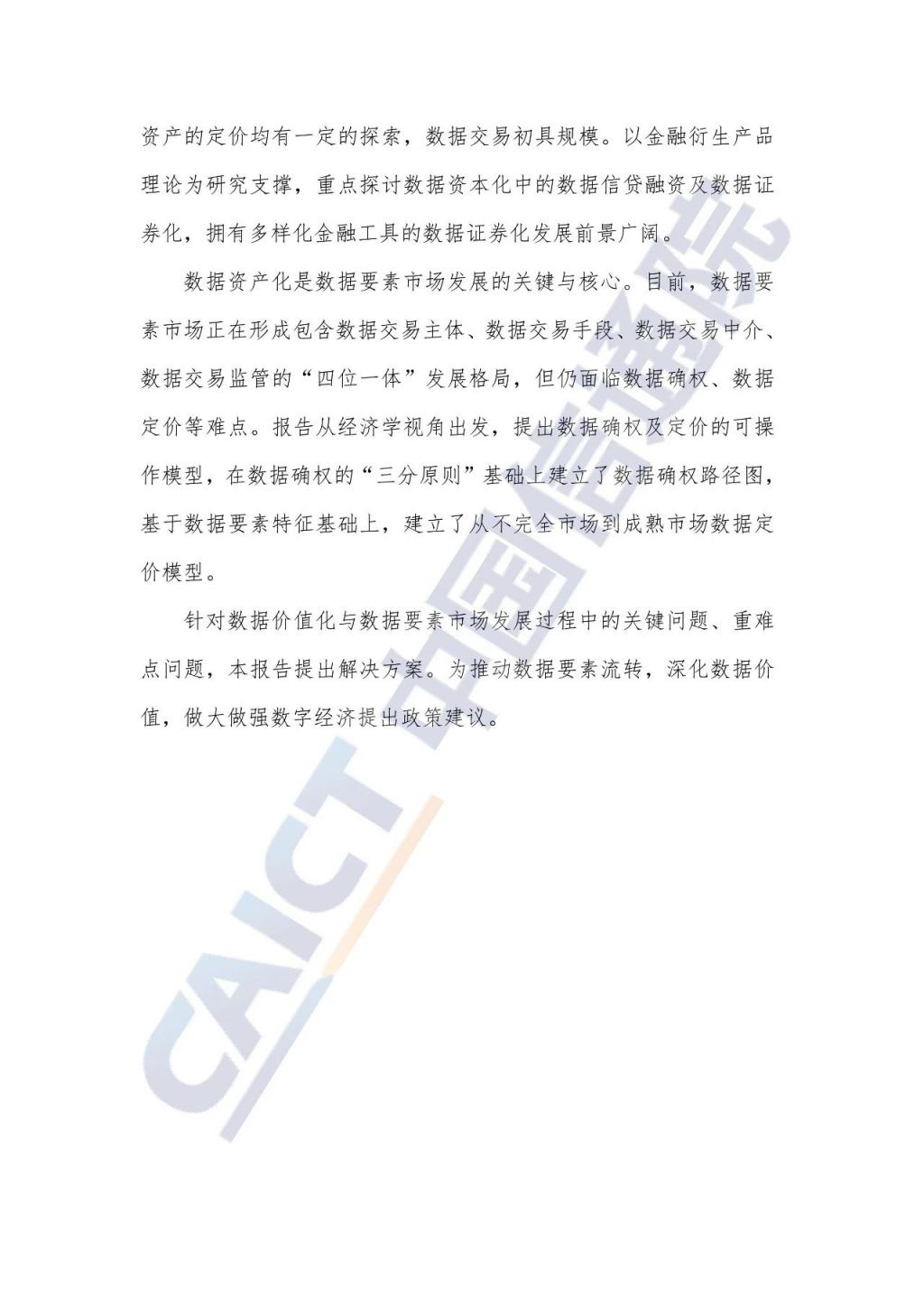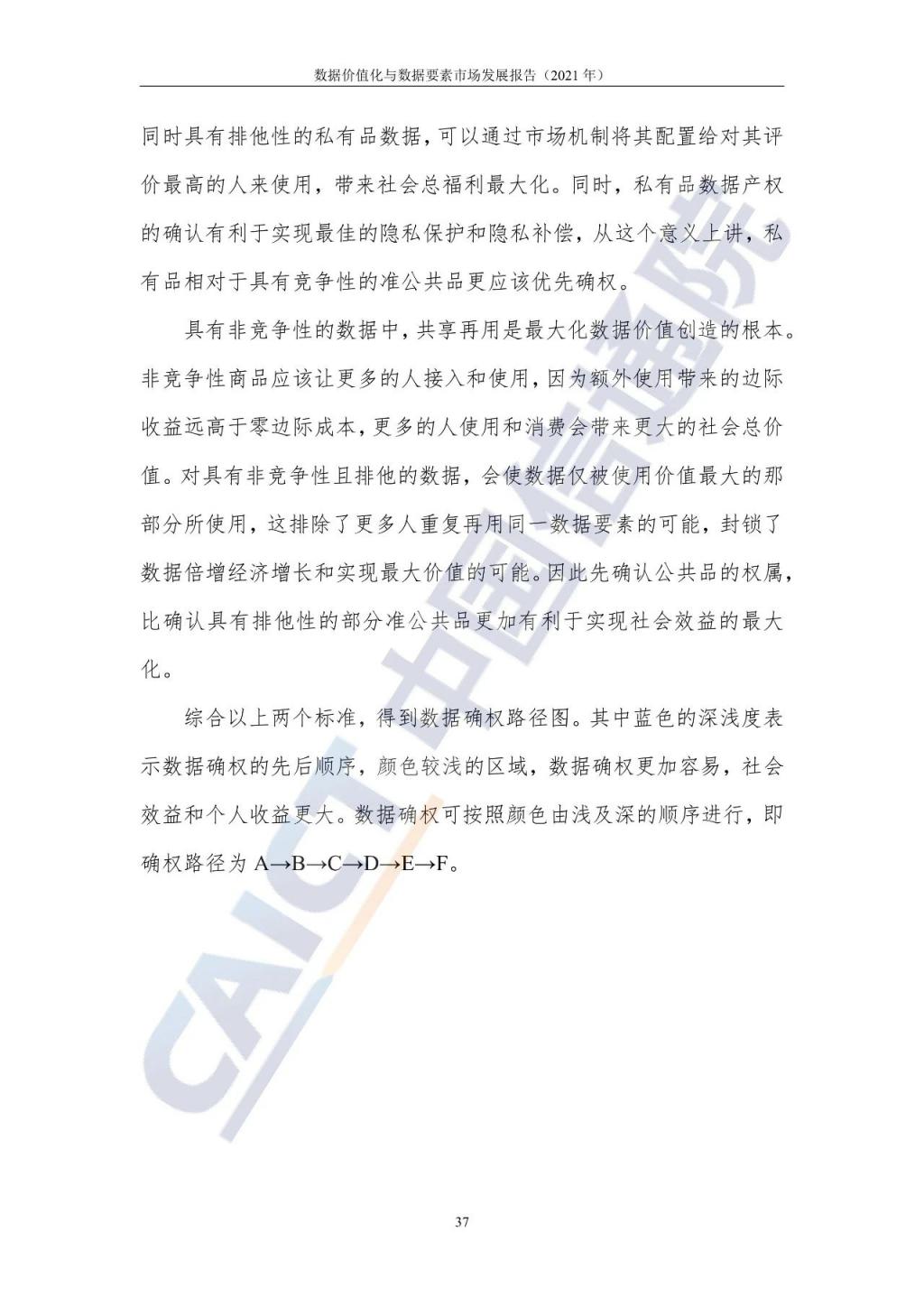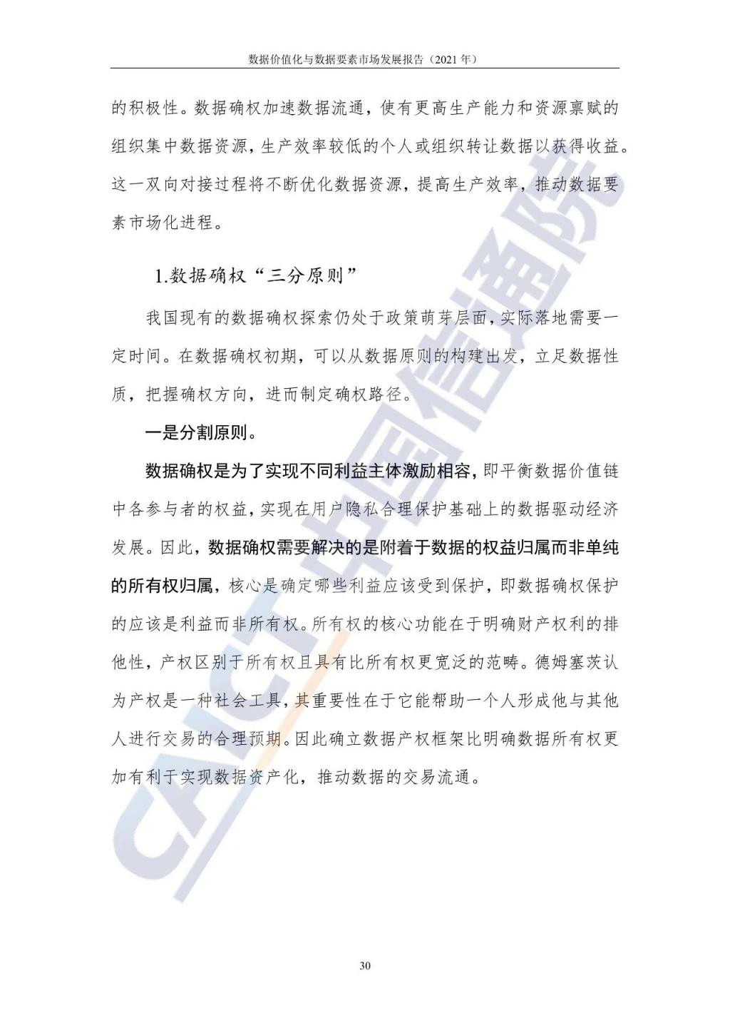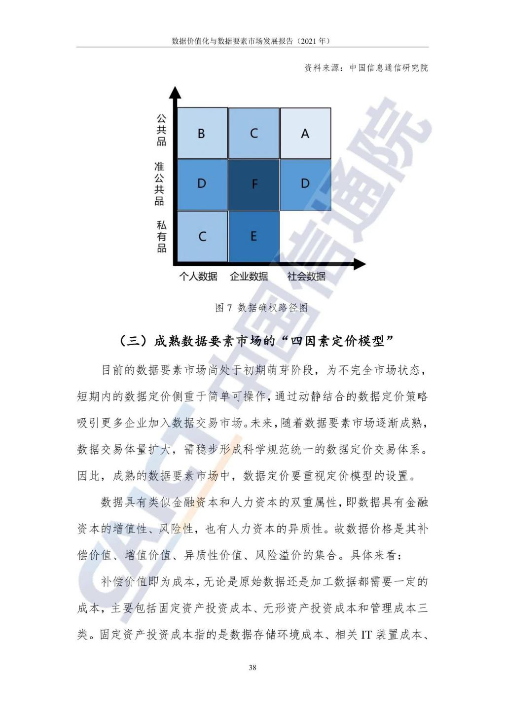 針對數(shù)據(jù)確權(quán)及定價等關(guān)鍵問題,報告從經(jīng)濟學(xué)視角出發(fā),根據(jù)數(shù)據(jù)確權(quán) " 三分原則 ",建立了數(shù)據(jù)確權(quán)路徑圖,構(gòu)建了從不完全市場到成熟市場數(shù)據(jù)定價模型,為推動數(shù)據(jù)要素流轉(zhuǎn)、挖掘數(shù)據(jù)價值、做大做強數(shù)字經(jīng)濟提供重要參考。