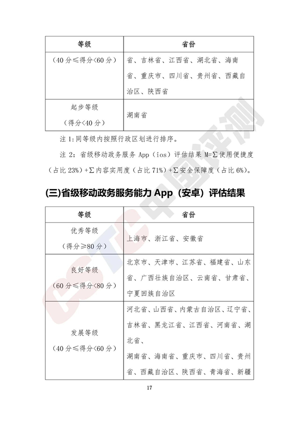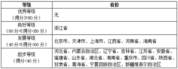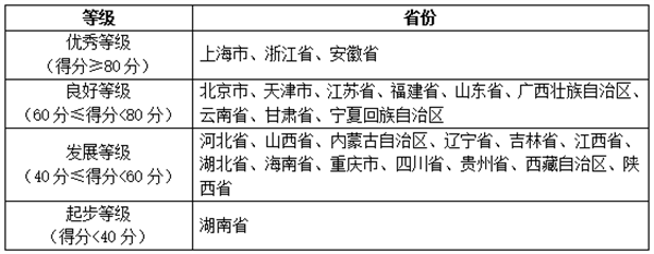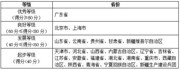 報告將各省移動政務(wù)服務(wù)渠道的綜合服務(wù)能力以及單項服務(wù)能力劃分為四個等級,分別是優(yōu)秀等級(得分≥80分)、良好等級(60分≤得分<80分)、發(fā)展等級(40分≤得分<60分)和起步等級(得分<40分),具體名單如下表所示: