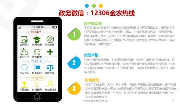 首先介紹12306金農(nóng)熱線,它整個應用的功能不止這三個,它的功能有幾十個入口,但是里面就有這么幾個入口。第一個是他們通過APP推了一個欄目,這個欄目是《阿文有話說》,通過這個欄目就可以進行融資,防范受騙,相當于是把信息轉化成了精品內(nèi)容。第二個是基于農(nóng)民老是會買到假種子,用戶關注度比較高的區(qū)域他設立了一個舉報的途徑。第三個是價格查詢,每天包括水稻、肉類的價格可以實時查詢到。