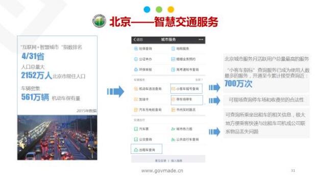 北京智慧交通服務亮點有:第一是關于小客車搖號查詢,大家恨不得每天一開號就關注,這是大家的痛點和關注的點。第二是和停車相關的,車一停立馬有一個老大爺過來收費,穿一個馬甲就可以收費,但是它具不具備合法性,你是不是一個合法的停車場,通過一個APP是可以闡釋的。
