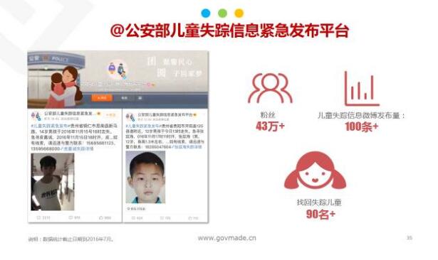 公安部兒童失蹤信息緊急發(fā)布平臺,現(xiàn)在有了43萬的粉絲量,其實這個平臺非常簡單,但是它抓住了現(xiàn)在整個社會的痛點,很多人孩子丟失了,雖然通過這個平臺才找到了90個兒童,但這90個兒童給大家更多的是一種希望,如果將來能把這個平臺真正的運用起來讓更多人關注,我們將來找到的人不只是這90個兒童。